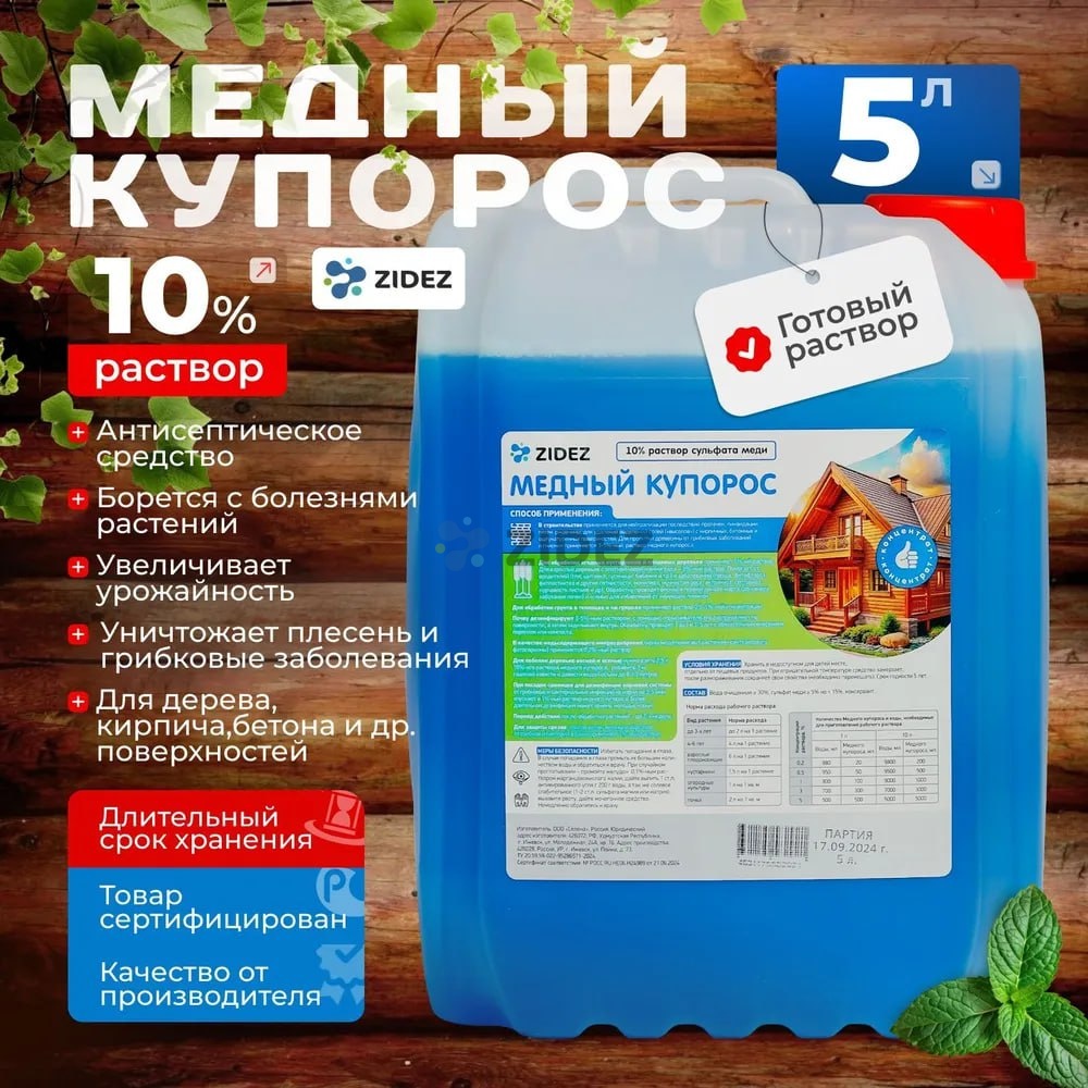 Состав: вода очищенная ≥ 30%, сульфат меди ≥ 5% но < 15%, консервант.